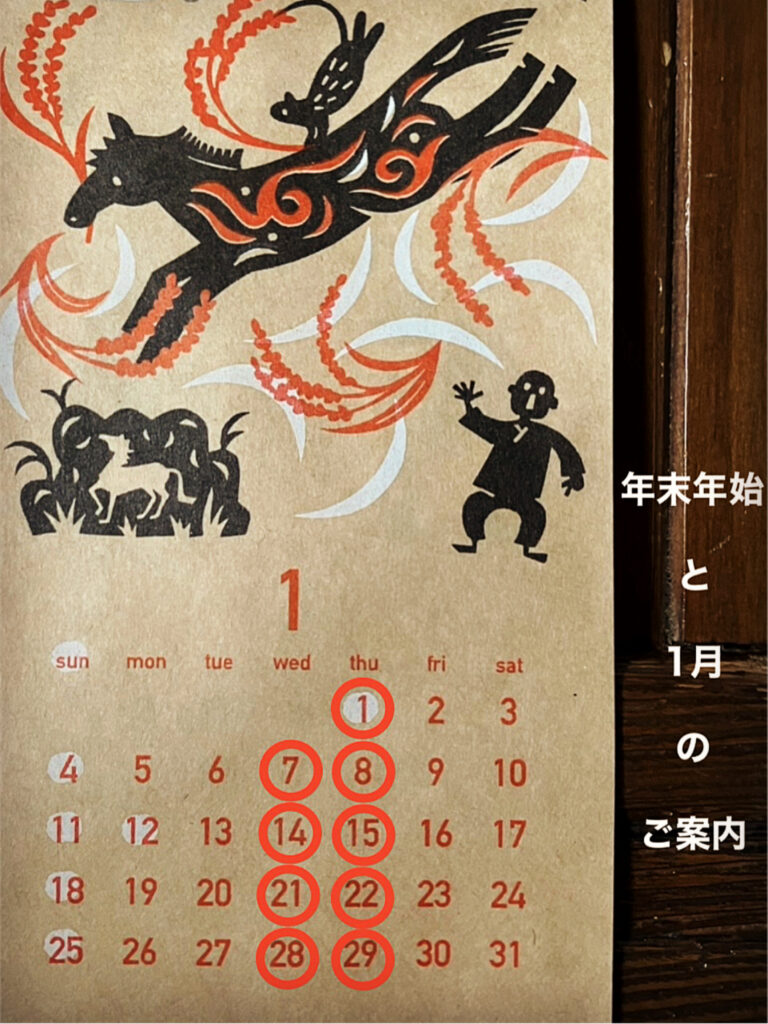 年末年始および1月の休業日は投稿写真の赤マルです。